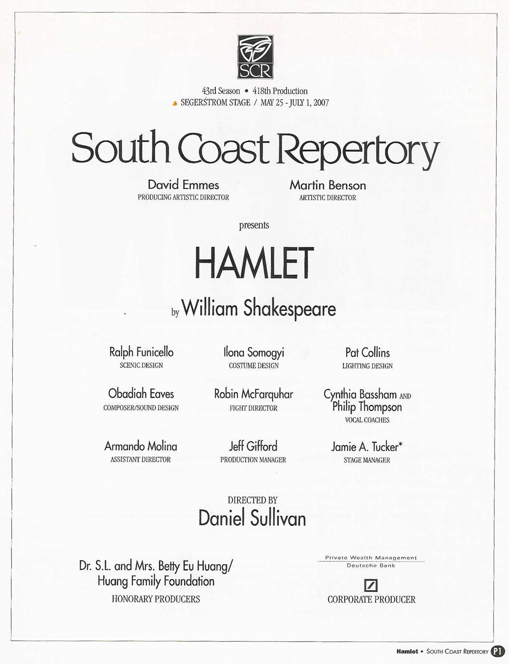 directed by Daniel SullivanDr. S.L. and Mrs. Betty Eu Huang/Huang Family Foundation and