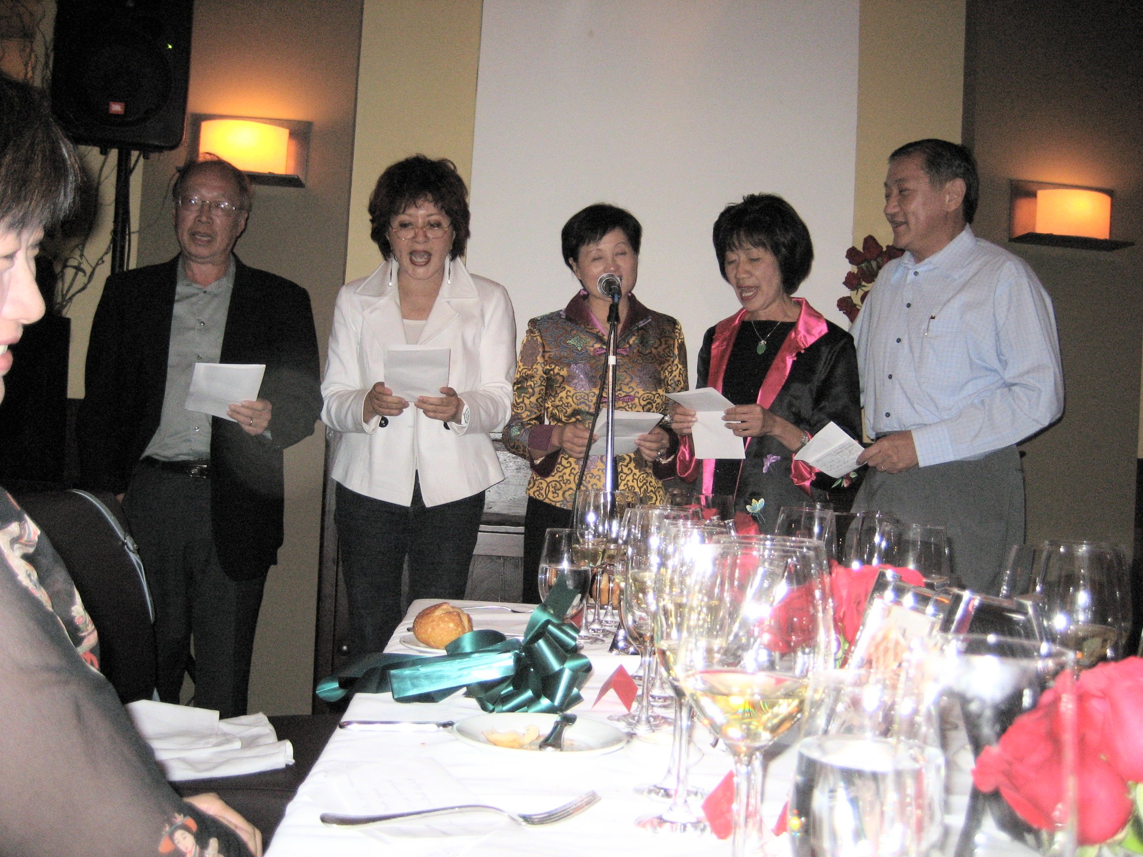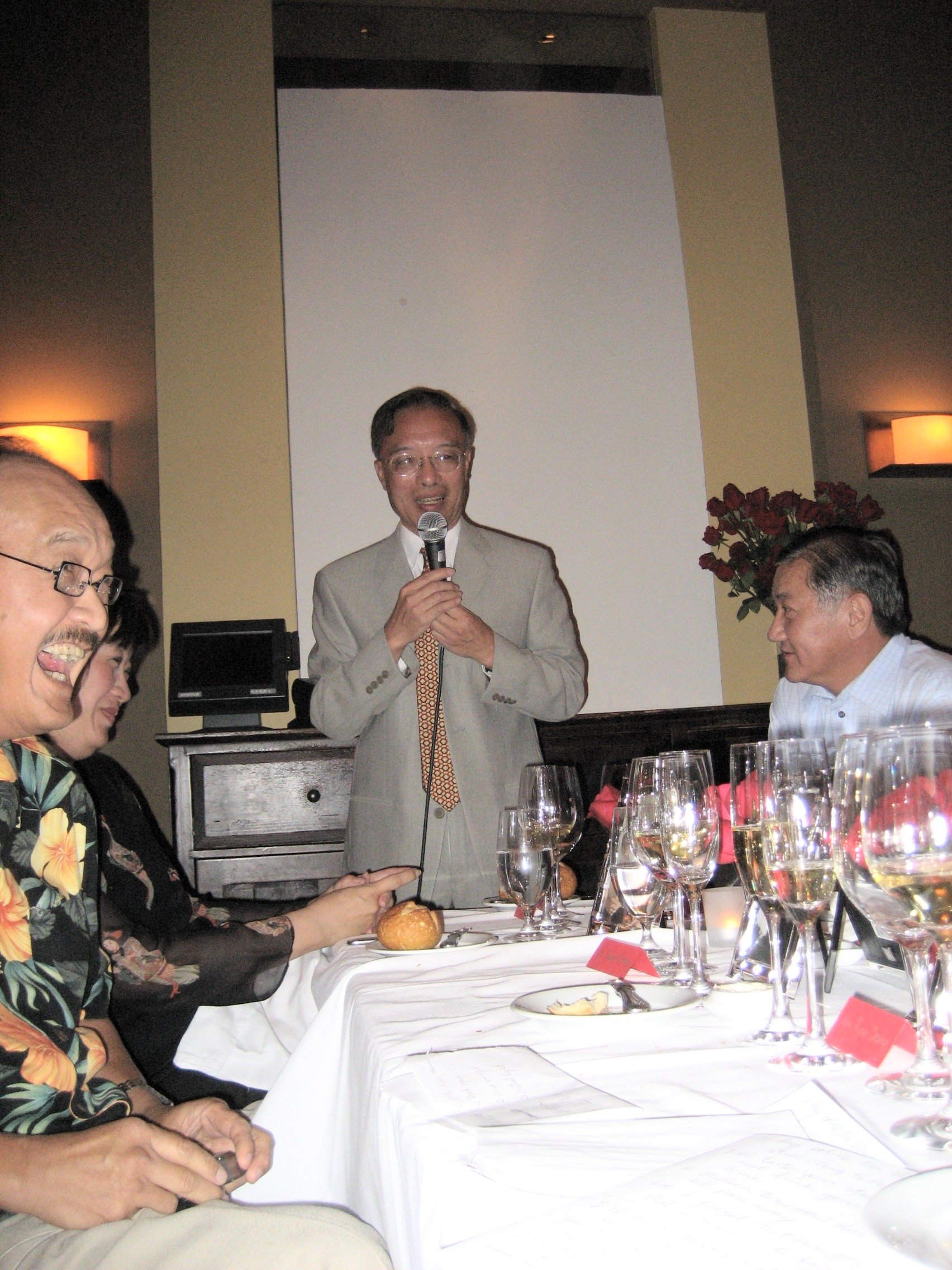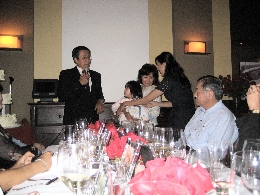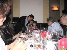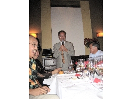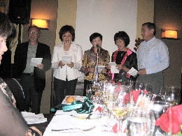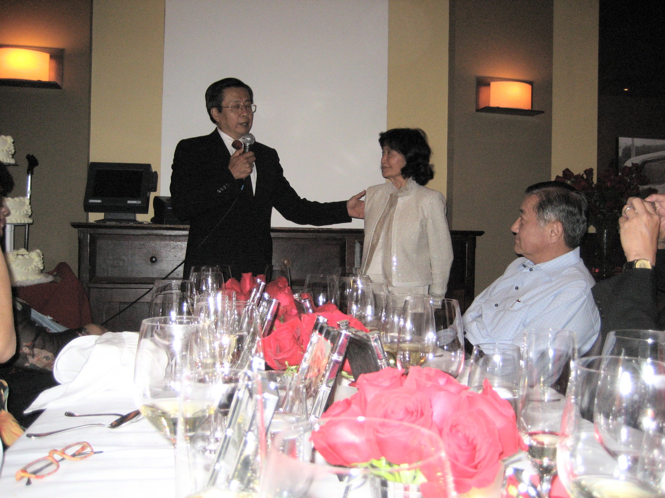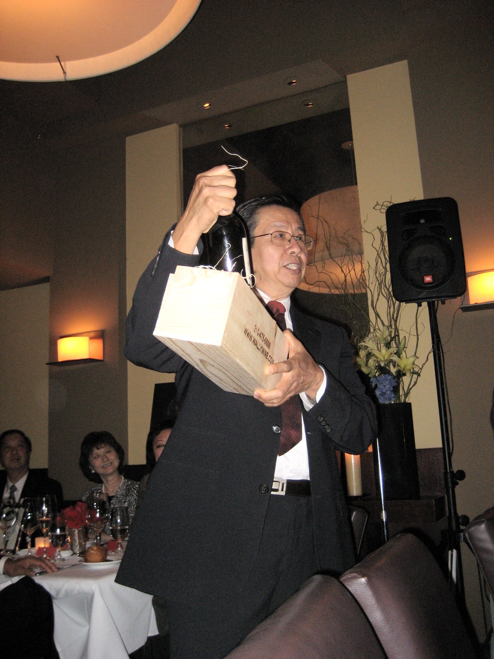 The dining area was decorated with poster size black and white photos of Rosalind and Milton's wedding 40 years earlier. More black and white photos were framed and placed at each place setting as decorations and gifts for the guests. Food at the Marche was excellent. The evening program was mostly impromptu but it came together as if they were rehearsed. Many friends and relatives made short speeches reminiscent of the good old days, while Phyllis and Amy quickly organized the Caltech Choir to show off their talents. After the July performance at Paul and Amy's party, the Choir was even more confident and won a lot of applause. Although the hosts specifically mentioned "No Gifts", it was hard for us to pass the opportunity to play up our organization, the "Wine and Meat Society". Paul was able to find a box of beef jerky and a bottle of 40 years old Chateau La Gaffeliere wine. After presenting the gift, Paul read the poem he composed just 24 hours ago.