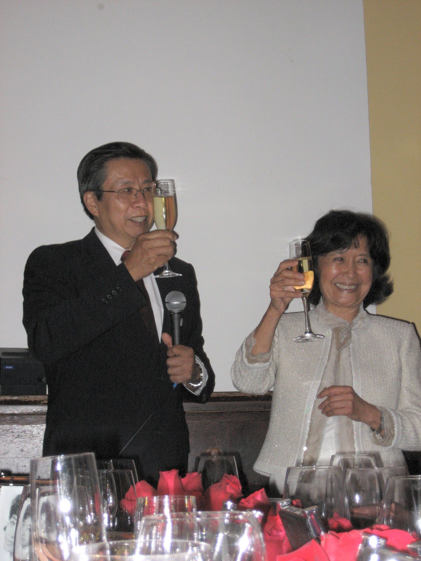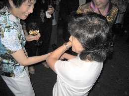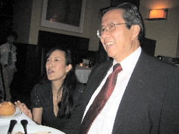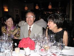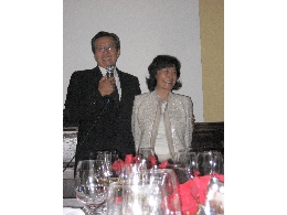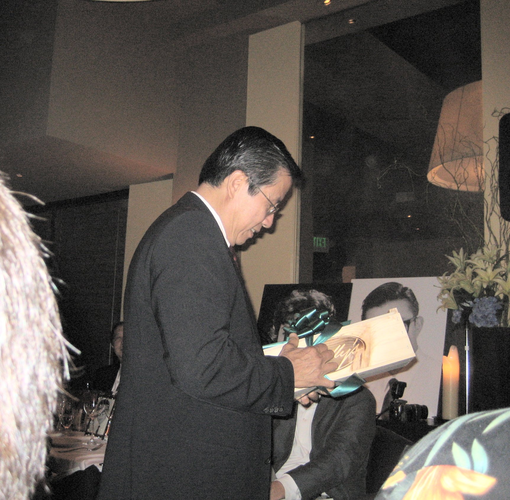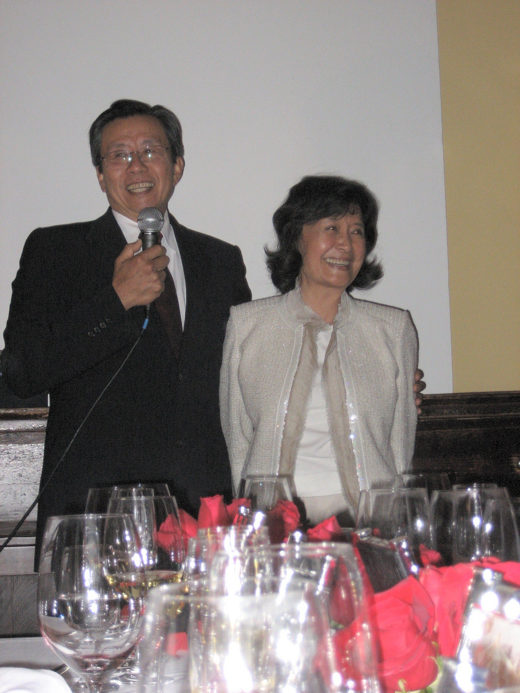 The dining area was decorated with poster size black and white photos of Rosalind and Milton's wedding 40 years earlier. More black and white photos were framed and placed at each place setting as decorations and gifts for the guests. Food at the Marche was excellent. The evening program was mostly impromptu but it came together as if they were rehearsed. Many friends and relatives made short speeches reminiscent of the good old days, while Phyllis and Amy quickly organized the Caltech Choir to show off their talents. After the July performance at Paul and Amy's party, the Choir was even more confident and won a lot of applause. Although the hosts specifically mentioned "No Gifts", it was hard for us to pass the opportunity to play up our organization, the "Wine and Meat Society". Paul was able to find a box of beef jerky and a bottle of 40 years old Chateau La Gaffeliere wine. After presenting the gift, Paul read the poem he composed just 24 hours ago.
