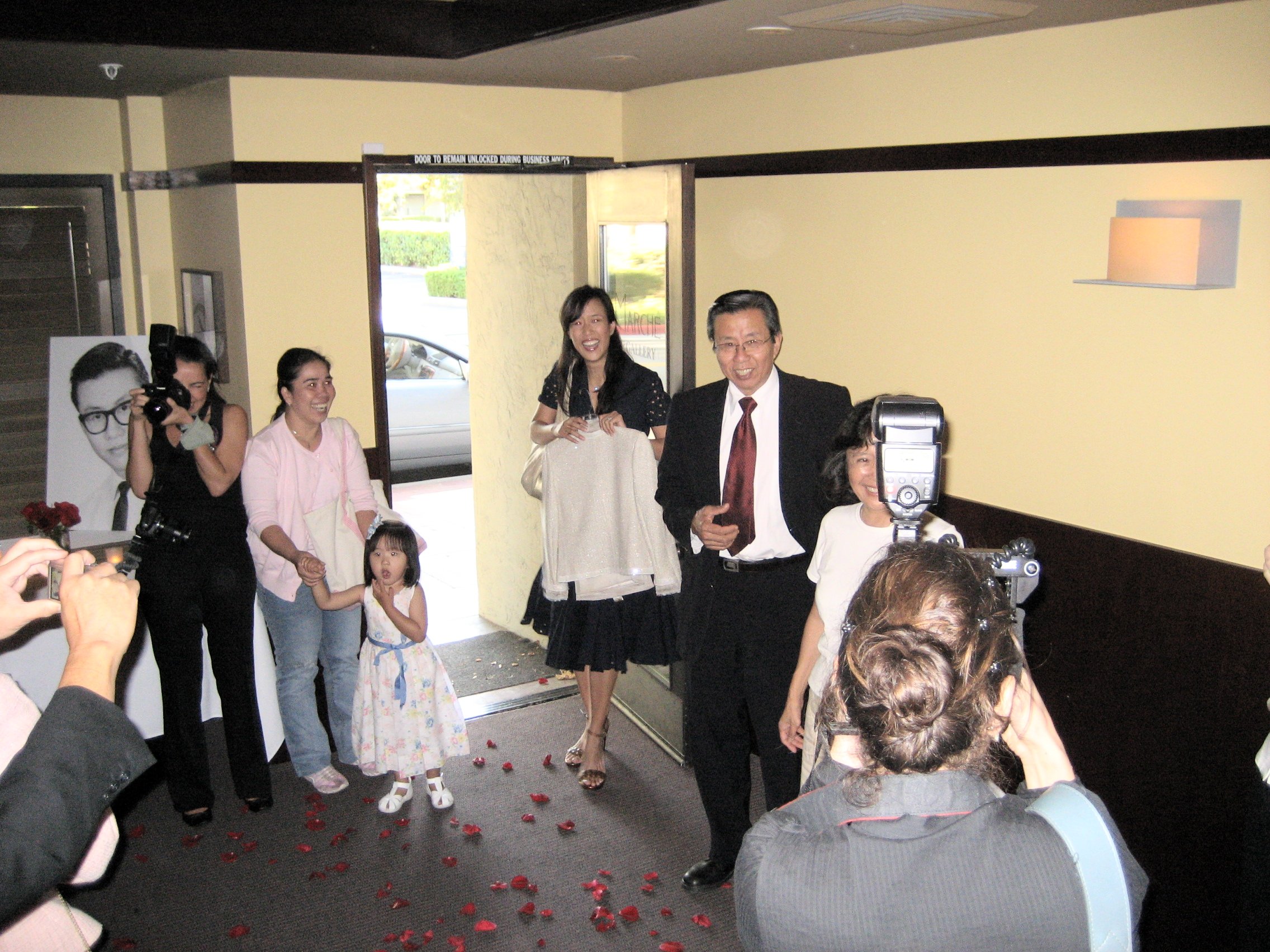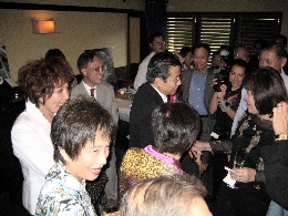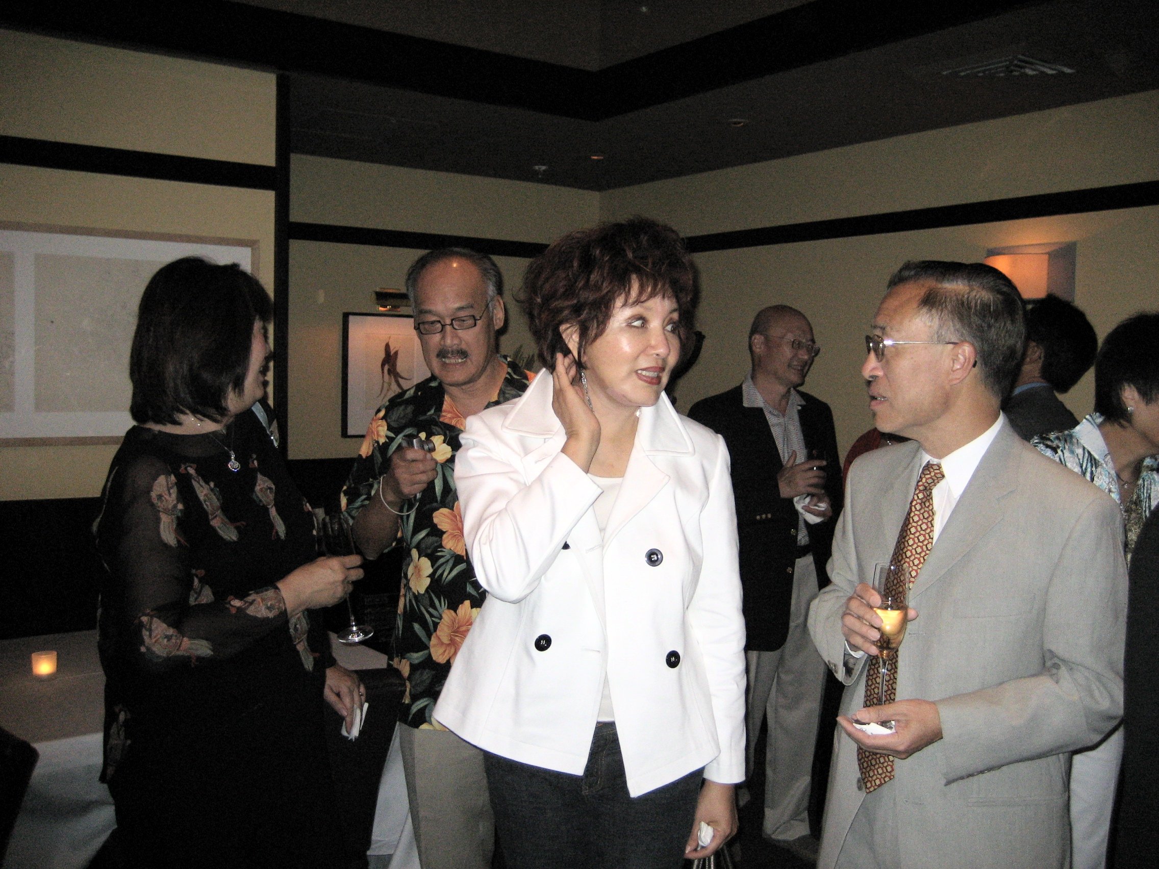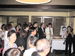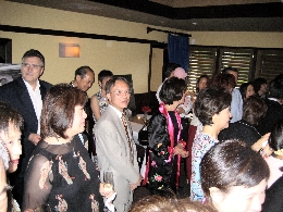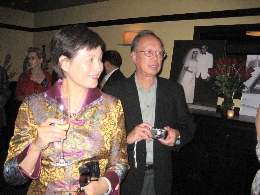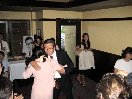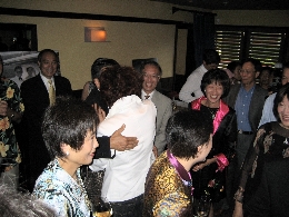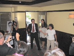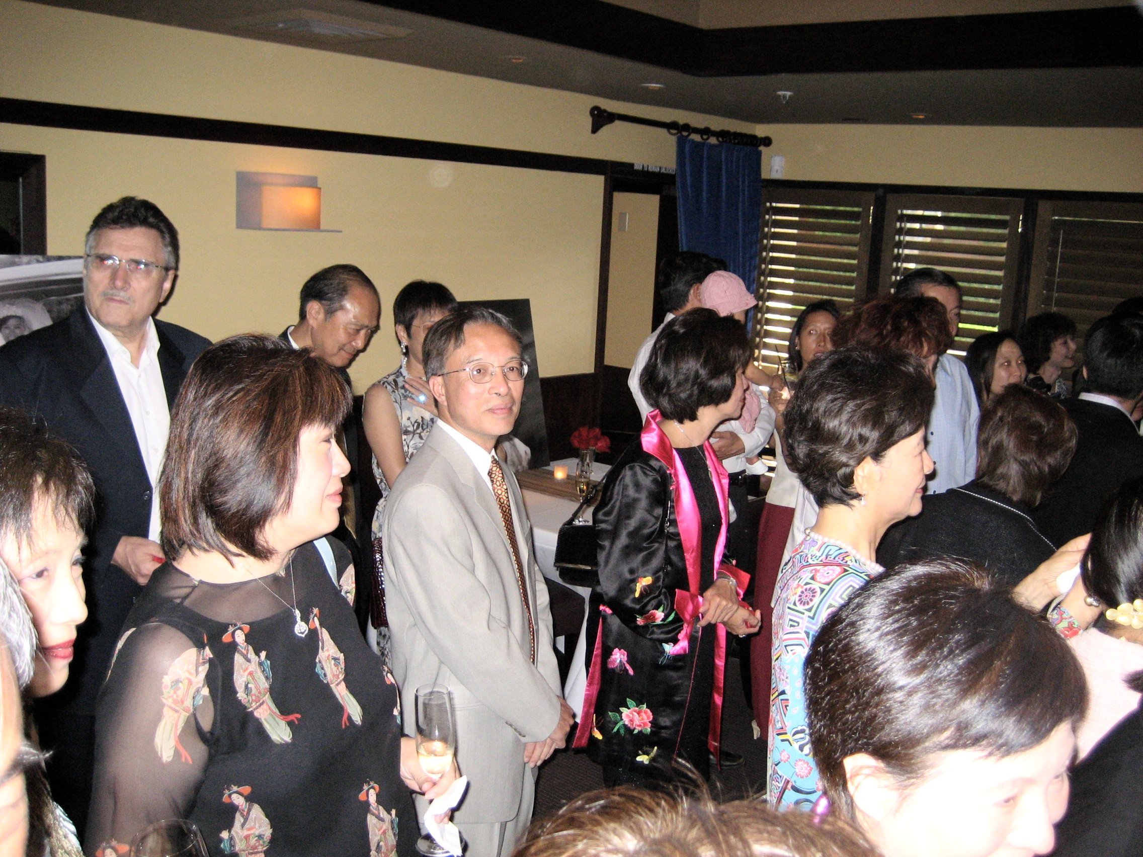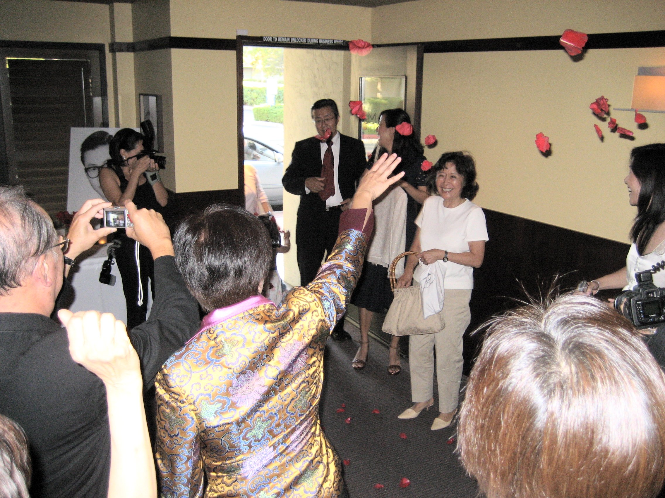 The Restaurant Marche was very close to the Stanford University and across the street from Yulanda and Felix's exquisite gift shop (Julie's). After an eye-opening tour of Julie's shop, we walked to the restaurant. There were about 70 guests in the dinning room with half of them from the Los Angeles area. Just before 6pm, we hid in the back room where Rosalind and Milton would make their entrance. When they arrived, they smiled with joy and hugged every body.