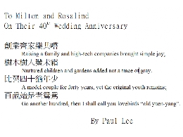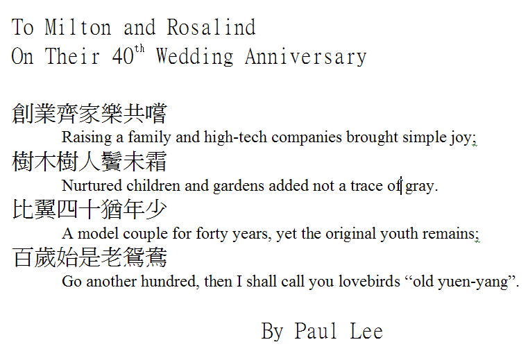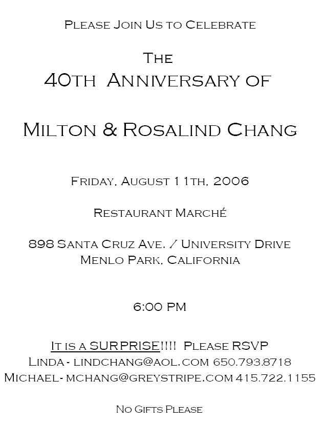With less than a month to prepare, Linda and Michael successfully staged a surprise party to celebrate their parent's 40th Anniversary. The party was well organized with thoughtful suggestions as to where guests could stay. Perhaps the hardest part of the preparations was keeping their parents from finding out prematurely. Milton was in Taiwan at the time, but Rosalind was at home with Linda's family. According to Dave (Linda's husband), Linda and Dave had to give excuses to Rosalind every time they went out to make arrangements. They said they had to buy wine for Dave, or to run an errand for Dave. It almost ruined Dave's reputation as if he was a horrible slave driver. It indeed was not easy to keep secrets for too long.