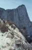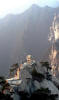 Wake-up call came in the form of a knock at the door around 5:15. We put on all our clothes, including an old army overcoat that we rented from the establishment and went up to the peak in the dark. The horizon was hazy which did not bode well for watching the sunrise. By 6:30, it became obvious that our effort was not going to be rewarded. We packed up and were on our way, having breakfasted on crackers and chocolate bar. We returned once again to the South Peak where we could now take pictures to record our journey for posterity. From this highest point we went past the inconspicuous Central Peak and came upon the famous ridge that led up to the West Peak. This is the impressive ridge that appears in postcards about Hua Shan. The actual path was far less dangerous than it appeared. At the peak there was a Taoist temple in excellent repair and several spots associated with famous legends. We explored these sites a bit and took a good look at the panoramic view of the valley and the river in the distance.