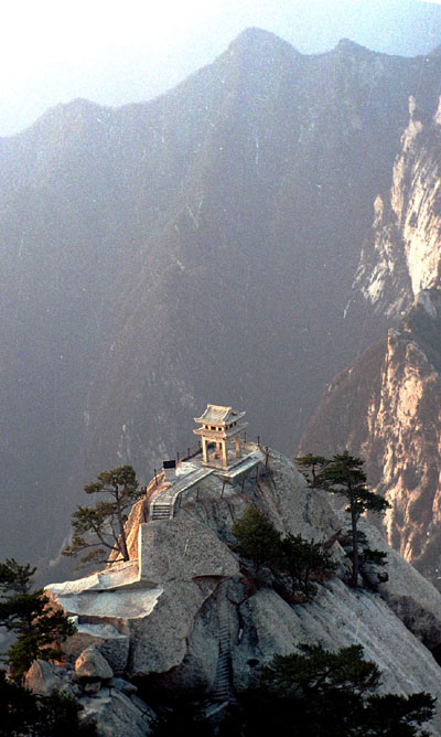Leaving our backpacks on the beds and went out to explore the mountain. In stark contrast to the gloom of the hotel room, the scenery outside was glorious. East Peak stood 7000 feet high, the second highest of the five peaks, and commanded a marvelous view of the mountain ranges beyond Hua Shan. There was a magnificently built but scarcely accessible pavilion for chess. The story was that before the founder of the Sung dynasty became king, he played the game here and lost three matches. When he persevered, his opponent pointed out that he had nothing more to bet on. The future king said he would give his opponent Hua Shan if he should again lose. He did lose. So when he became king he exempted the Hua Shan district from government taxes. This was possibly the first reputed incident of a successful political candidate giving a tax break to his early benefactor.